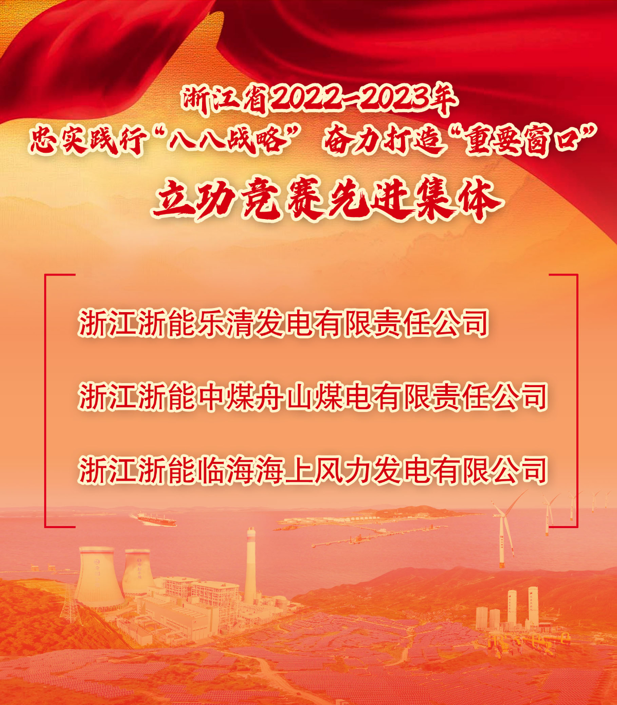 日前,浙江省人民政府公布2022-2023年忠實(shí)踐行“八八戰(zhàn)略” 奮力打造“重要窗口”立功競賽先進(jìn)集體和先進(jìn)個(gè)人名單,對100個(gè)先進(jìn)集體和200名先進(jìn)個(gè)人予以通報(bào)表彰。浙能所屬樂清發(fā)電公司、舟山煤電公司、臨海海上風(fēng)電公司榮獲先進(jìn)集體。