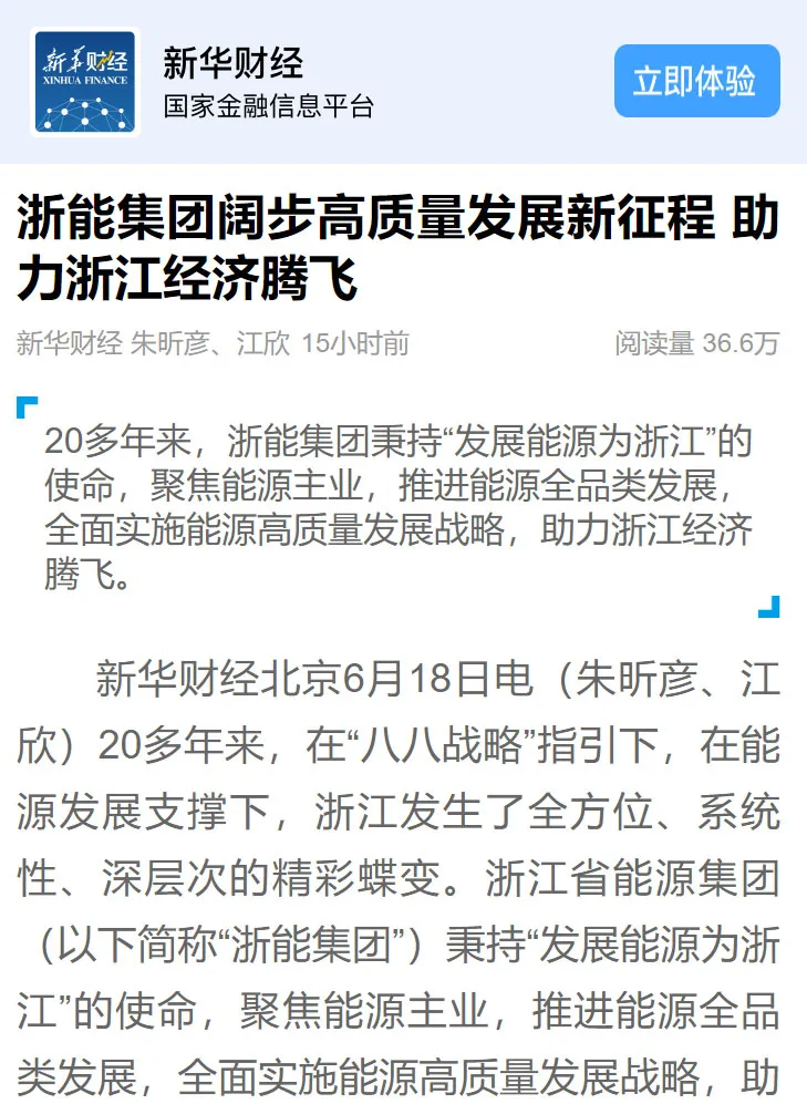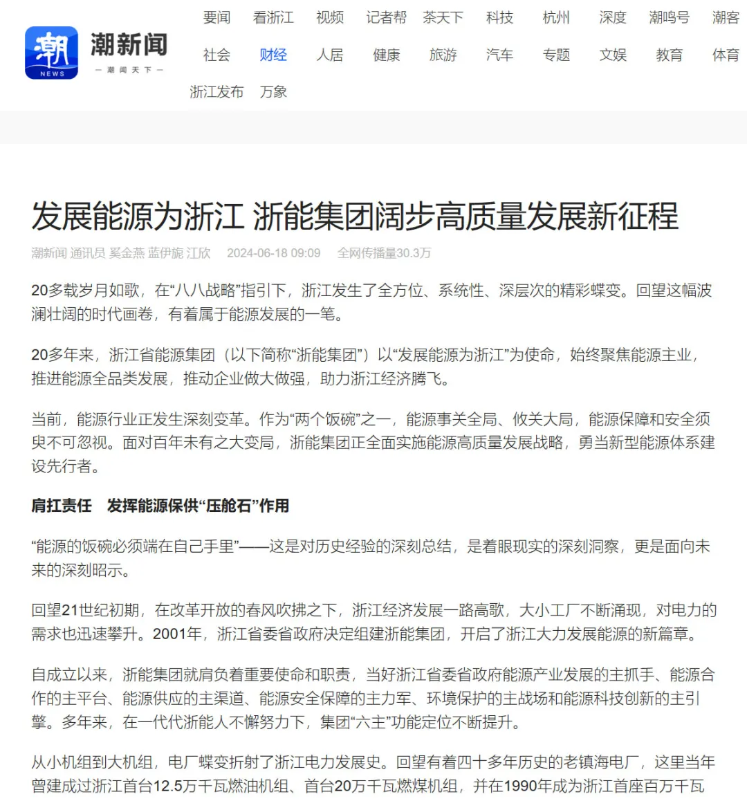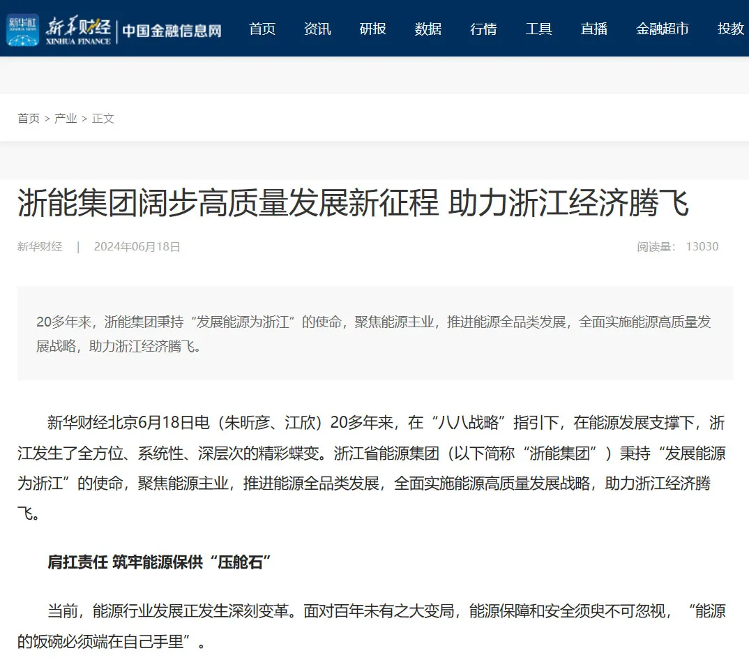 6月18日,東方財富網報道《發展能源為浙江 浙能集團闊步高質量發展新征程》。