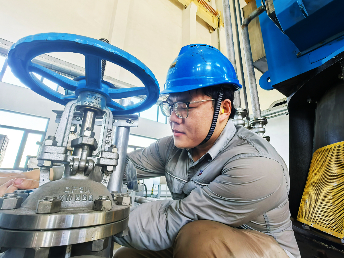 樂電汽機班張皓杰在循泵房開展閥門檢修作業。 陳清瑜 攝