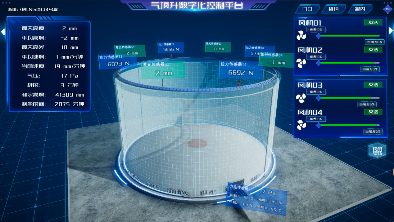 浙能六橫LNG項目共建4座儲罐,每座儲罐穹頂重達千噸,氣頂升上升高度相當(dāng)于“爬”上14層樓。為確保穹頂升起均衡平穩(wěn),項目使用了數(shù)智化頂升系統(tǒng),通過密布罐體的傳感器實時監(jiān)控頂升數(shù)據(jù),結(jié)合三維可視化智控,大幅減少了人工操作帶來的誤差,讓氣頂升的過程變得精準(zhǔn)、智能、安全。