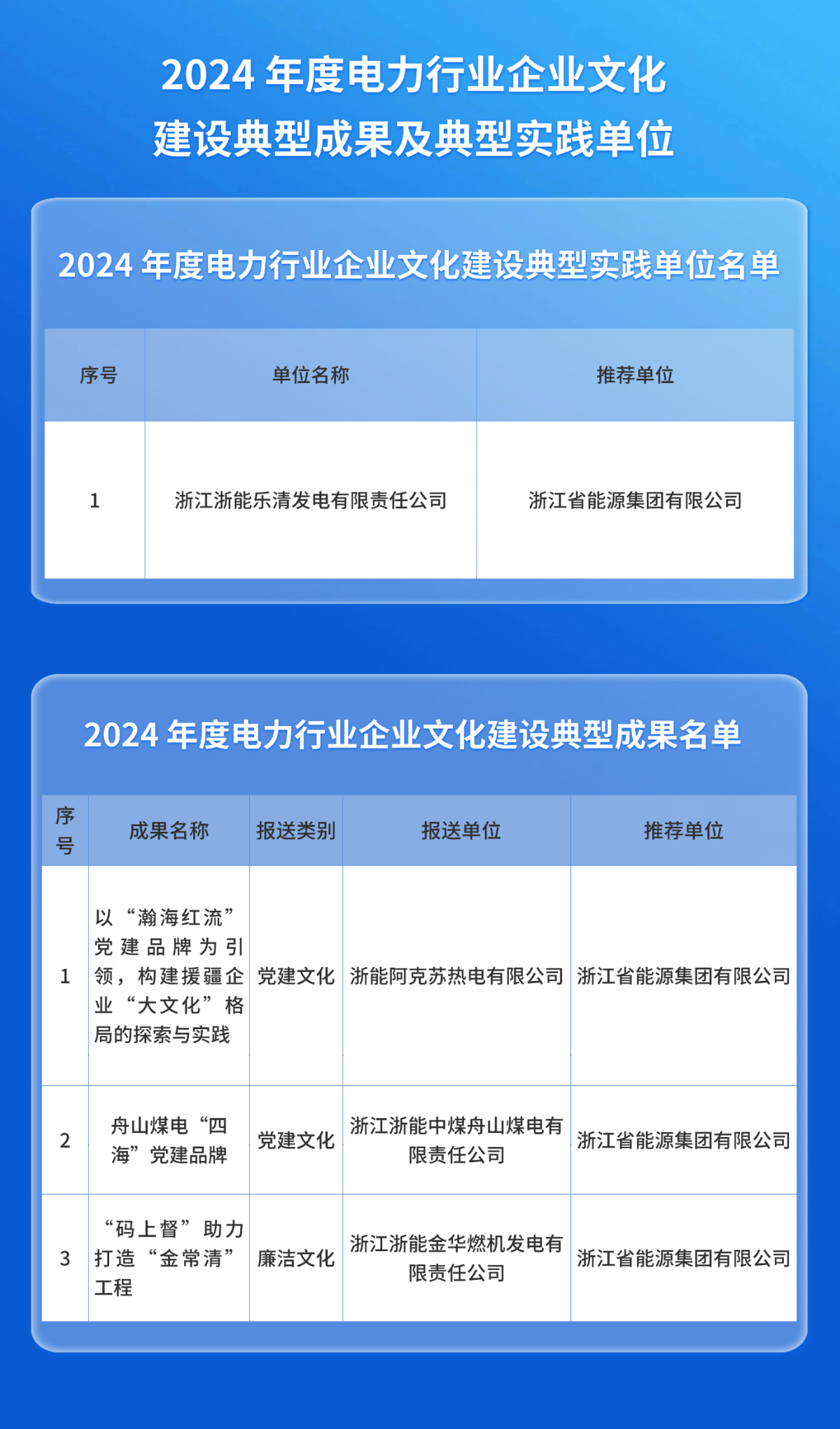 一直以來,浙能集團高度重視企業文化建設,把企業文化作為踐行使命擔當、驅動改革發展的精神動力和價值遵循。集團著力黨建領航、強根鑄魂、能力提升和實干擔當,把企業文化的“軟實力”轉化為推動集團轉型升級和高質量發展的“硬支撐”。集團系統各單位不斷探索實踐、傳承創新,努力形成既與浙能集團文化一脈相承,又具有各自特色的企業文化建設成果,實現了浙能文化在集團系統的延伸與落地,擦亮了浙能企業文化“金名片”。此次入選的建設成果及典型單位充分展現了浙能集團在電力行業企業文化建設中的代表性和影響力。