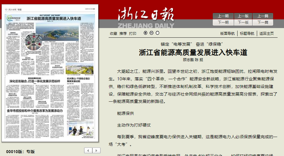 近日,《浙江日?qǐng)?bào)》推出了“能源高質(zhì)量發(fā)展”專欄,其中12月12日至13日集中式刊文報(bào)道浙能六橫電廠二期工程、嘉興電廠和白馬湖實(shí)驗(yàn)室等,展現(xiàn)浙能集團(tuán)聚焦高質(zhì)量能源保供和高質(zhì)量綠色轉(zhuǎn)型兩大核心任務(wù),勇當(dāng)新型能源體系建設(shè)先行者,助力浙江高質(zhì)量發(fā)展。