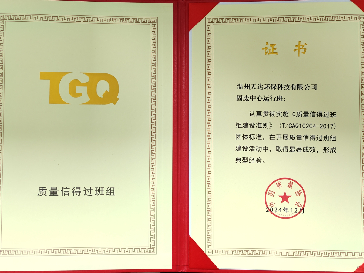 溫州天達環保科技有限公司固廢中心運行班組“全國質量信得過班組”榮譽證書。 傅催然 攝