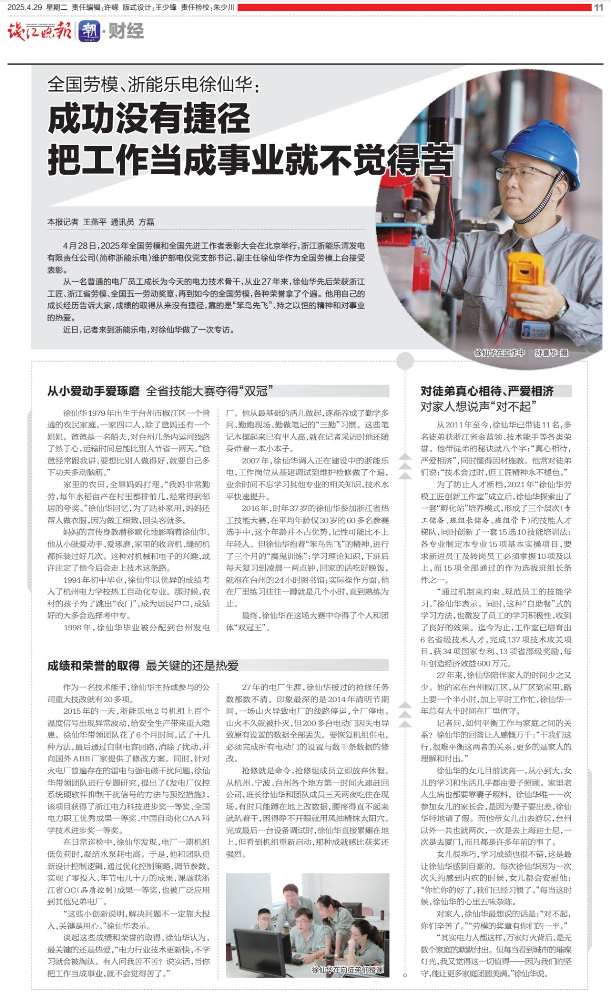 4月29日,錢江晚報報道《全國勞模、浙能樂電徐仙華:成功沒有捷徑,把工作當成事業就不會覺得苦》。 錢江晚報 提供