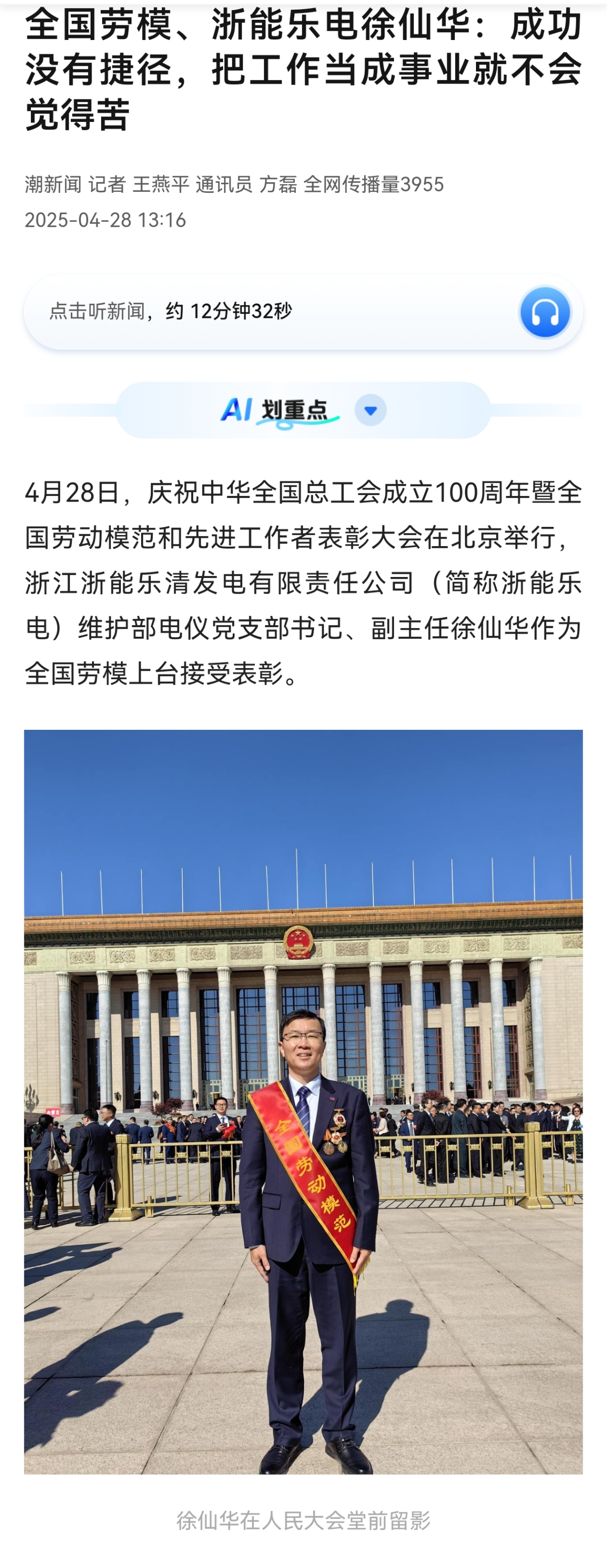 4月29日,人民日報旗下中國能源網報道《全國勞模、浙能集團徐仙華:于極峰中“摘星” 以匠者心點燈》 中國能源網 攝
