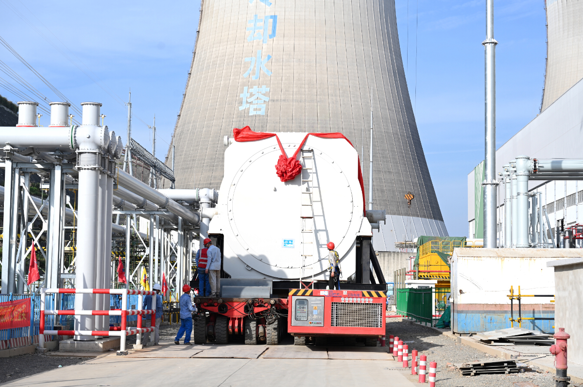 當日上午9時10分,3號機發電機定子開始起吊,在現場起重人員和技術人員的緊密協作、精準操作下,經起鉤、懸停、提升、轉向、行走、下落、調整等動作后,定子穩穩落位在臺板上,一次吊裝成功,圓滿完成吊裝任務。