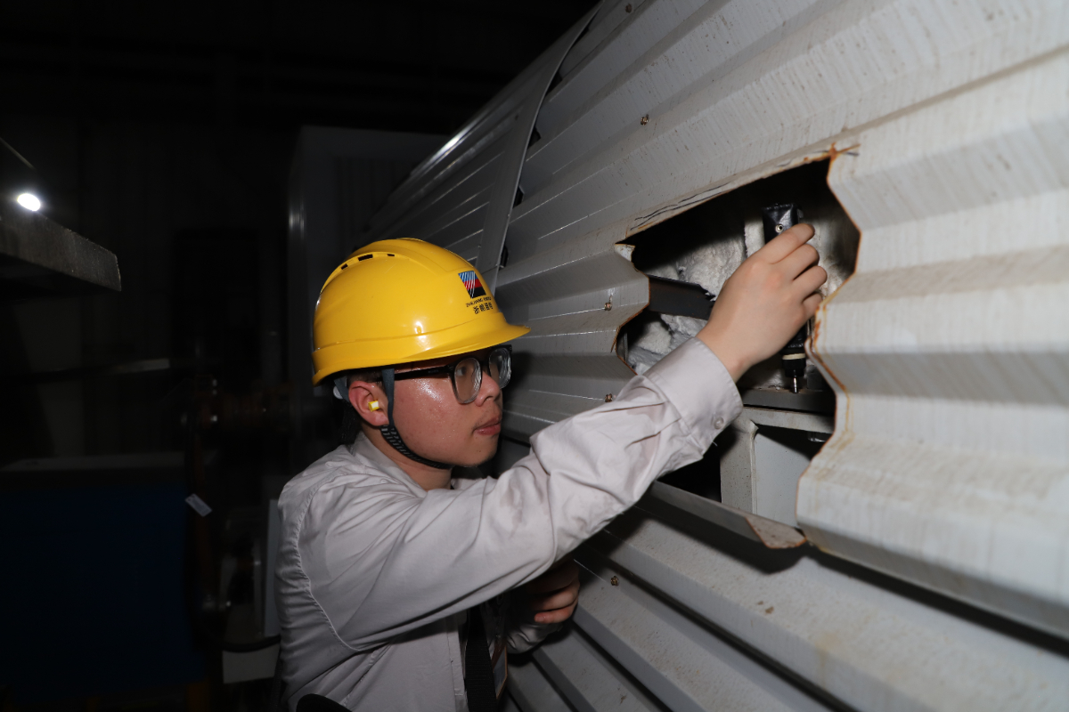 浙能溫電7號機定子溫度測點深藏于維修孔內(nèi)。身材高大的周超泉深吸一口氣,側身、蜷縮,將自己“塞”進了那個狹窄的維修孔。空間逼仄無法轉身,汗水瞬間浸透工裝,肩胛輪廓在濕布下清晰凸顯。他右手持扳手在方寸間精準施力,左手打光照明,將原有的溫度測點切換到了備用溫度測點。當信號恢復平穩(wěn),他脫出“卡位”,長舒一口氣,這才感覺到整個后背的衣衫早已被汗水完全浸透,濕漉漉地緊貼在身上,勾勒出他專注工作后疲憊卻滿足的身影,正是他為保障機組“神經(jīng)末梢”敏銳暢通所付出的證明。
