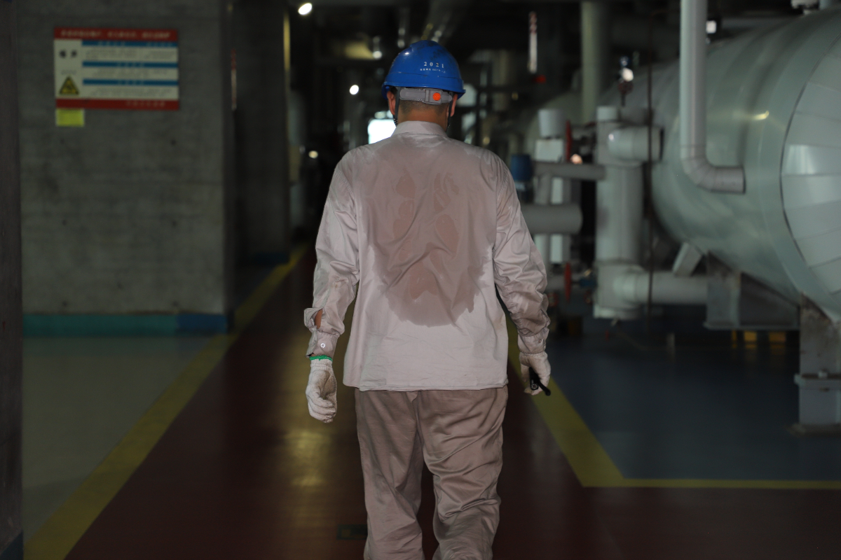 浙能溫電四控巡檢明子堯在巡檢路上就已汗?jié)竦暮蟊场?鄭健安 攝