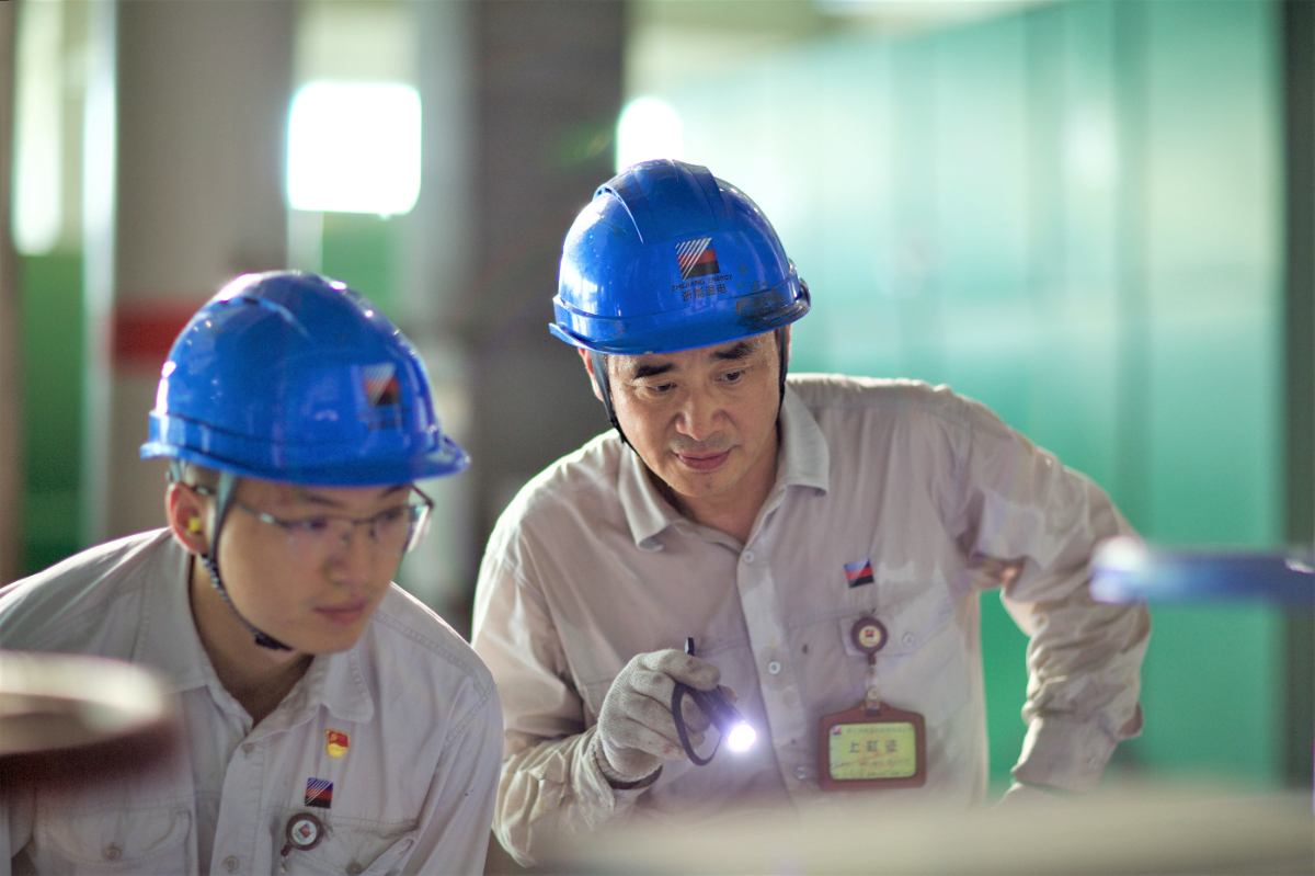 浙能溫電維護部汽機一班副班長馬曉暉與班組骨干一起進行設備消缺前檢查。 葛曉葵 攝