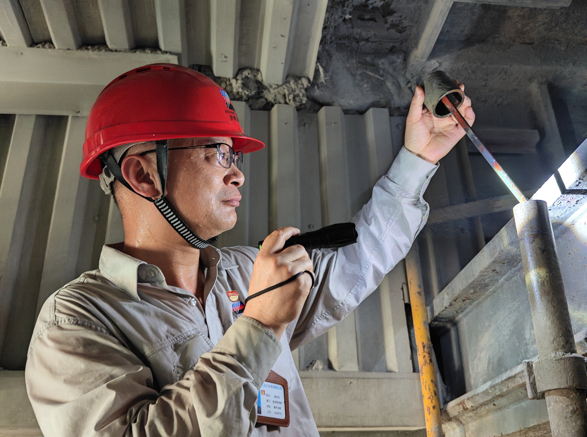 岑一洋每日深入現(xiàn)場,以“時(shí)時(shí)放心不下”的態(tài)度緊盯關(guān)鍵環(huán)節(jié)。煤場內(nèi)悶熱不通風(fēng),在里面待上半小時(shí),人就像從水里撈出來一樣。在輸煤棧橋,岑一洋俯身仔細(xì)檢查16A皮帶邊緣的磨損情況。這條皮帶作為上煤“主動(dòng)脈”,在迎峰度夏期間幾乎不停歇運(yùn)轉(zhuǎn),承擔(dān)取煤入倉和提升庫存的雙重任務(wù)。在難得的皮帶停運(yùn)間隙,他通過眼看、手摸等方式,不放過任何一處磨損隱患,確保這條“能源生命線”暢通無阻。