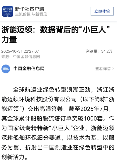 全球航運業綠色轉型浪潮正勁,浙江浙能邁領環境科技股份有限公司(以下簡稱“浙能邁領”)交出亮眼答卷:截至2025年7月,其全球累計船舶脫硫塔訂單突破1000套。作為國家級專精特新“小巨人”企業,浙能邁領深耕船舶環保細分賽道,以技術為基、以服務為翼,折射出中國制造業在綠色轉型中的創新活力。
