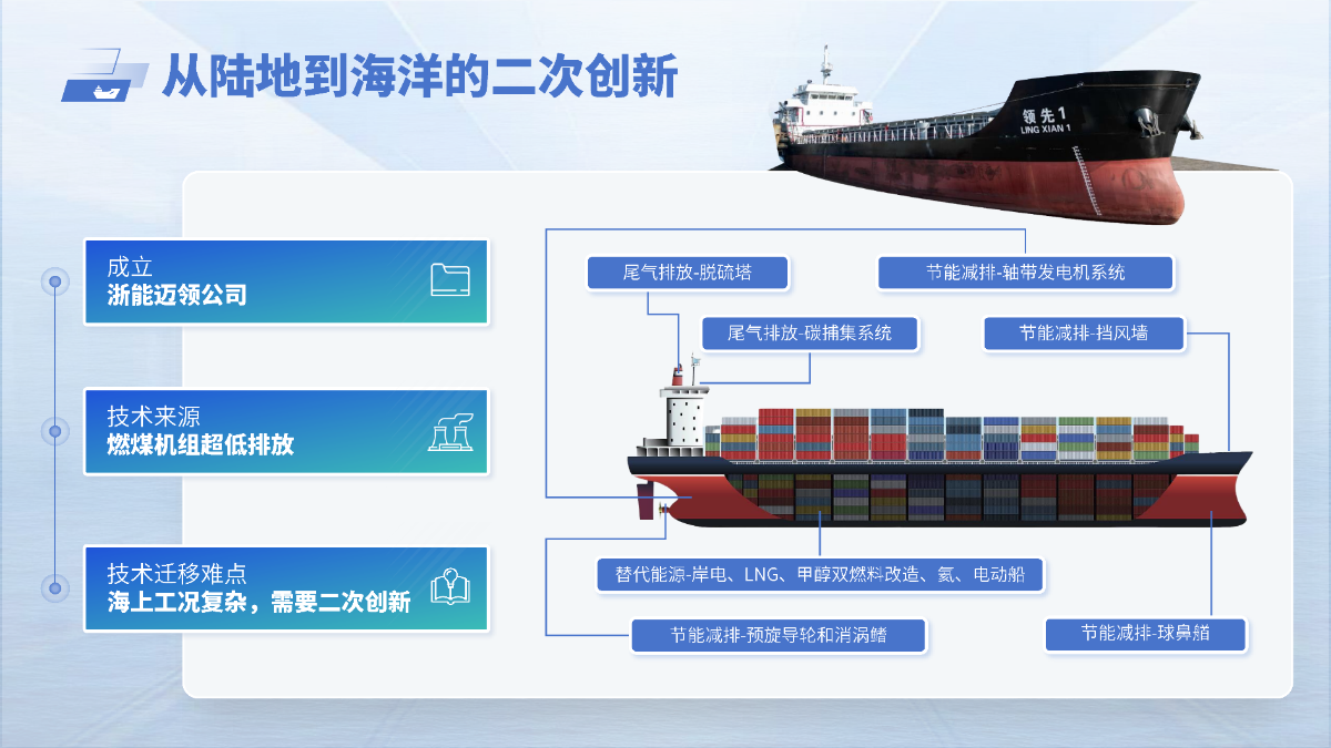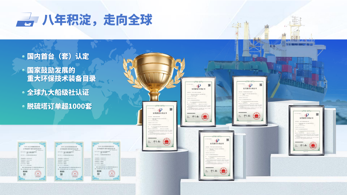 浙能邁領作為浙能集團綠色航運業務的重要平臺,依托浙能集團國家技術發明獎一等獎超低排放技術及相關基礎研究,持續推動船舶環保技術的創新與工程轉化。面向國際海事組織“限硫令”帶來的行業需求,公司逐步創新迭代船舶脫硫技術:攻克形成了海水鎂基二氧化硫吸收強化技術、緊湊型高效洗滌塔等一批科研成果,研發出了全國首套混合式船舶脫硫系統,并獲得全球九大船級社的運行認證。