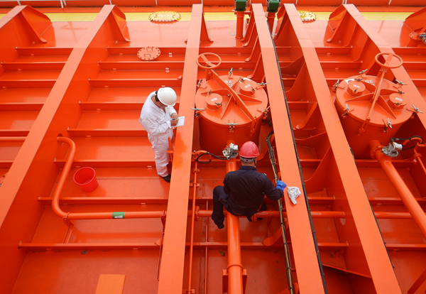 ▲ “浙能油1”輪與碼頭方在船舶卸油前進(jìn)行量油檢測(cè)。