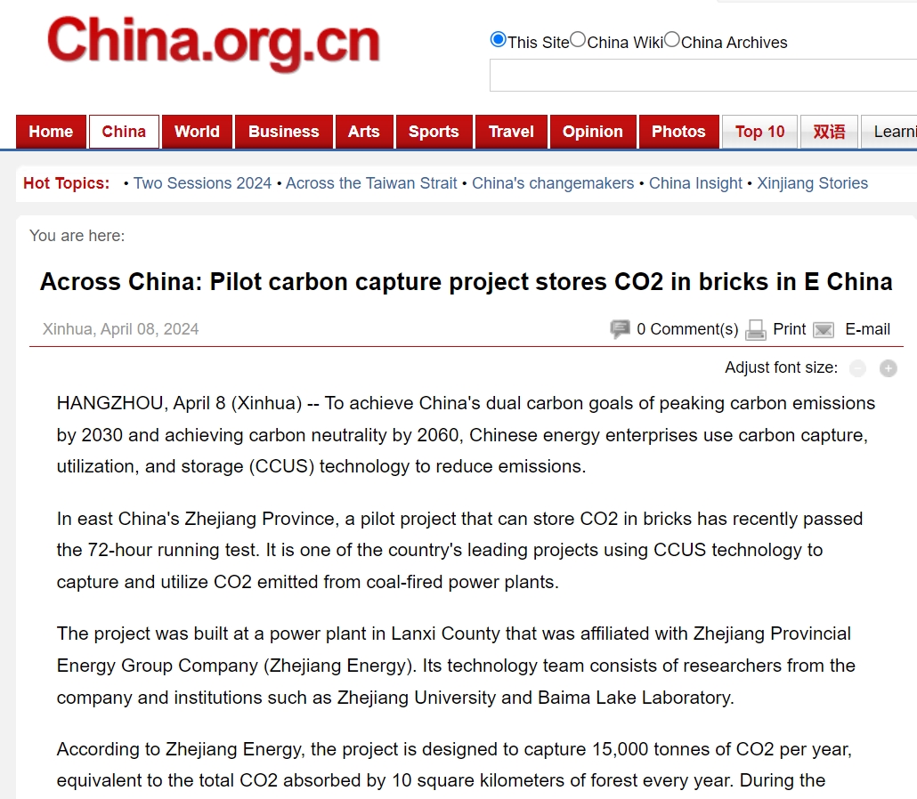4月8日,中國網英文版報道《Across China: Pilot carbon capture project stores CO2 in bricks in E China》。 中國網 圖