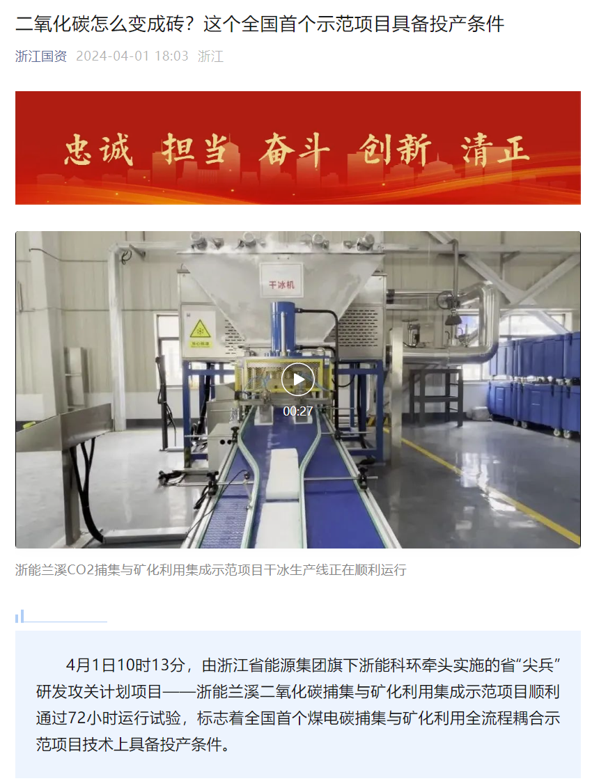 4月1日,省國資委“浙江國資”公眾號發布《二氧化碳怎么變成磚?這個全國首個示范項目具備投產條件》。 浙江國資公眾號 圖
