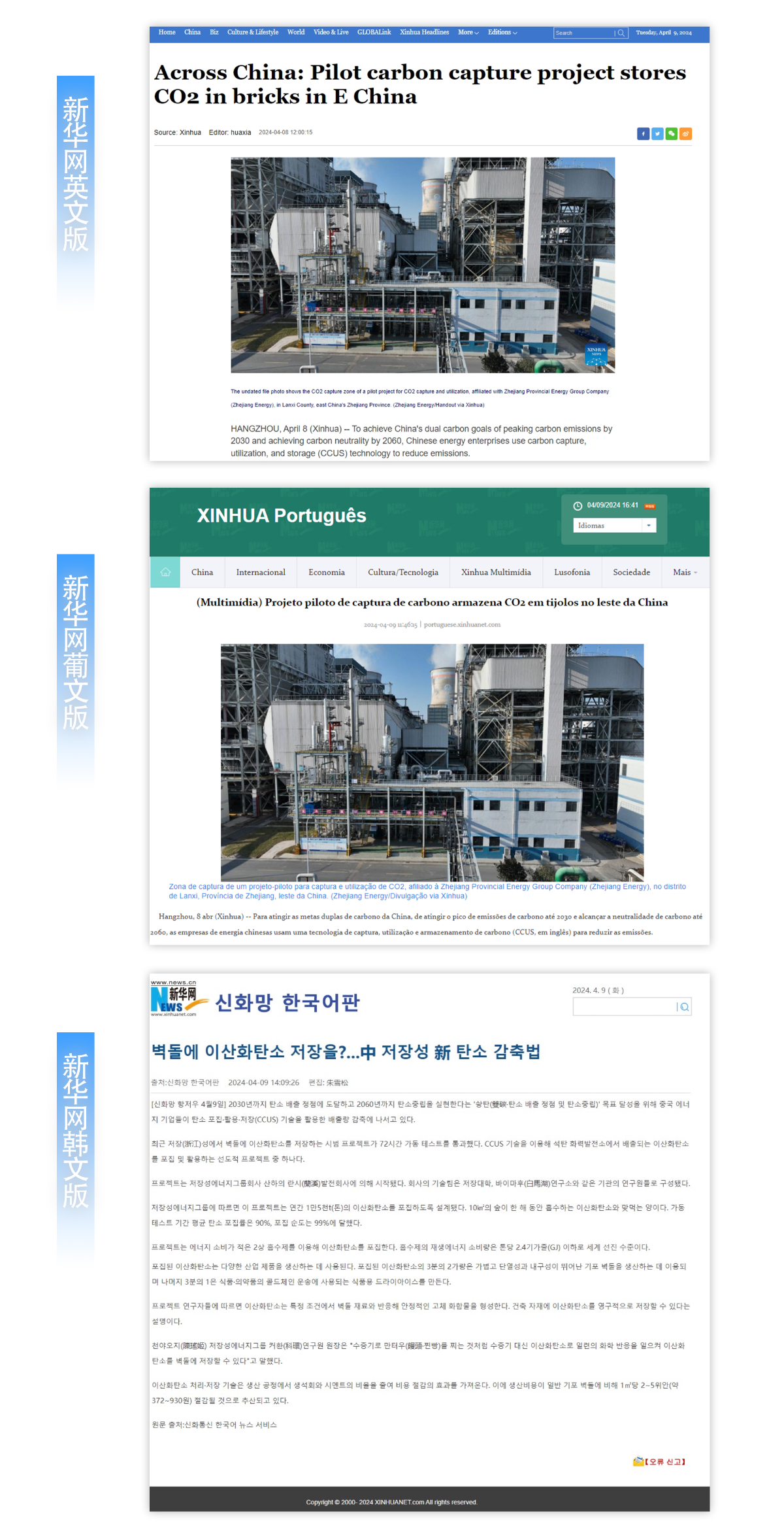 4月8日,新華社刊發英文、葡文、韓文外文通稿,報道浙能集團“捕碳高手”。 新華社 圖