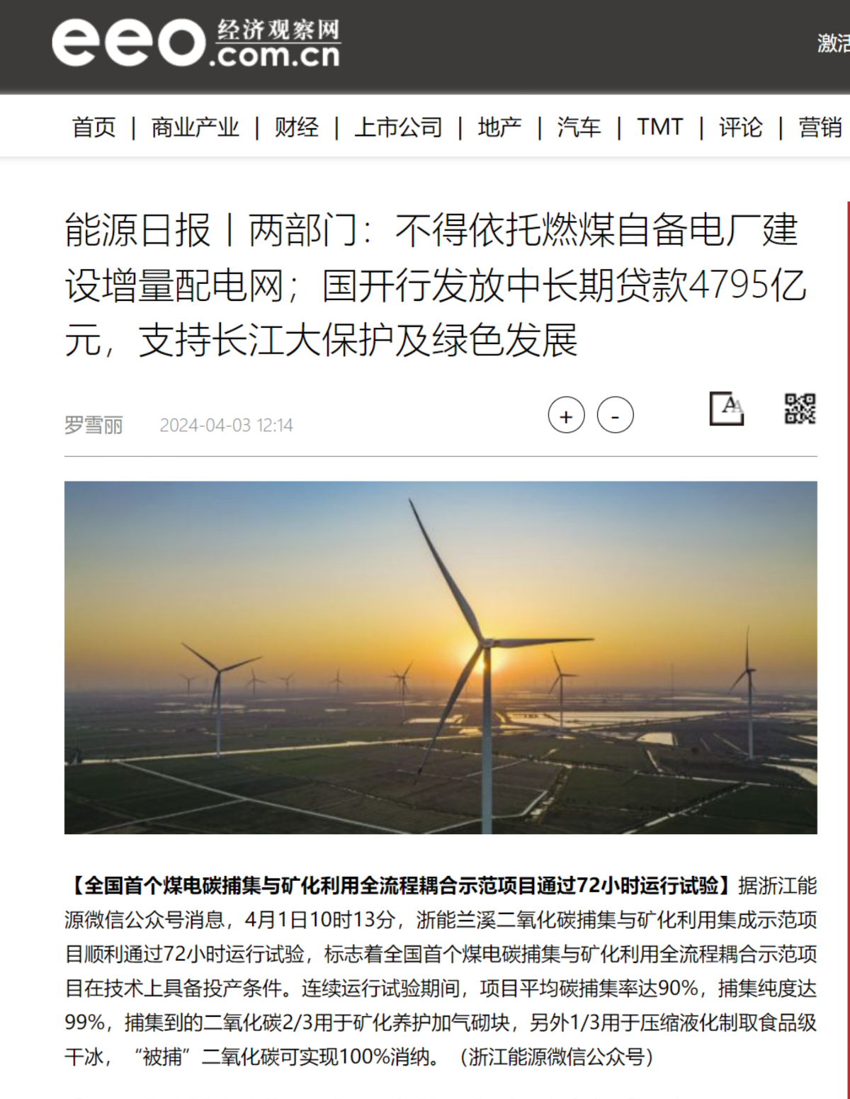 4月3日,經濟觀察網能源日報專欄轉載報道《全國首個煤電碳捕集與礦化利用全流程耦合示范項目通過72小時運行試驗》。 經濟觀察網 圖